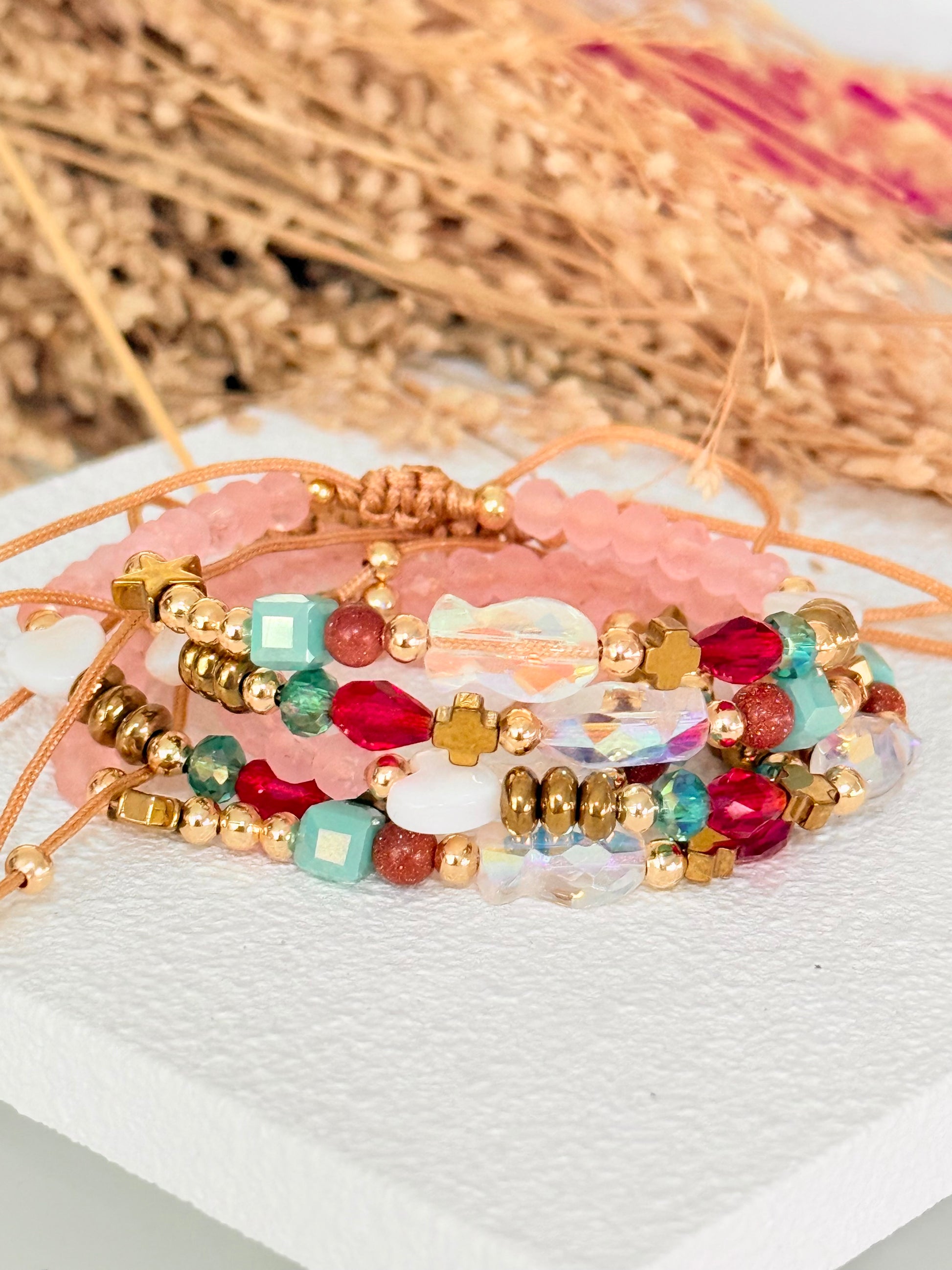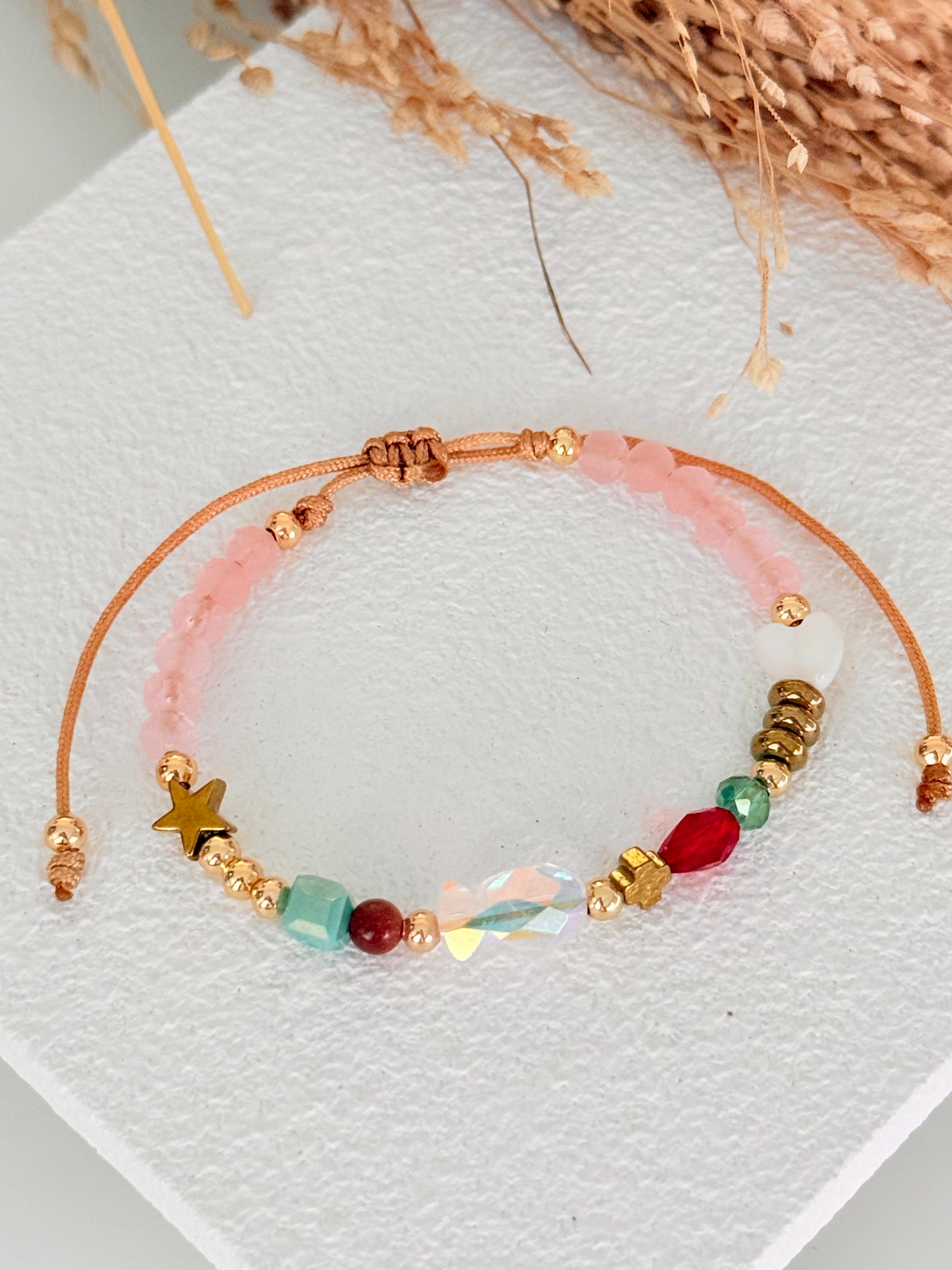 Hecha a mano con amor, esta pulsera ajustable en hilo está compuesta por piedras naturales, cristales que reflejan luz con cada movimiento, y balines enchapados en oro que simbolizan la pureza y la promesa divina.