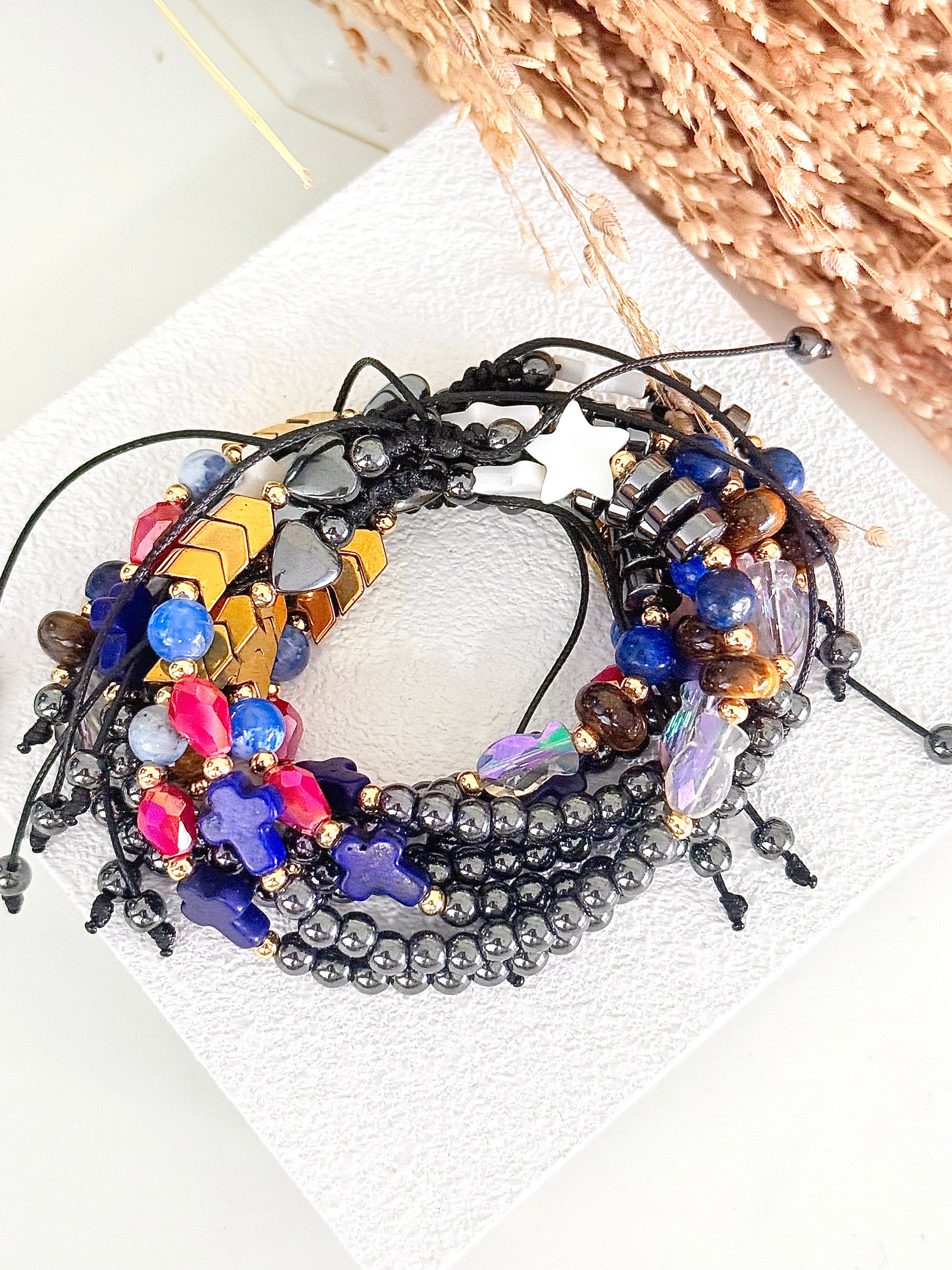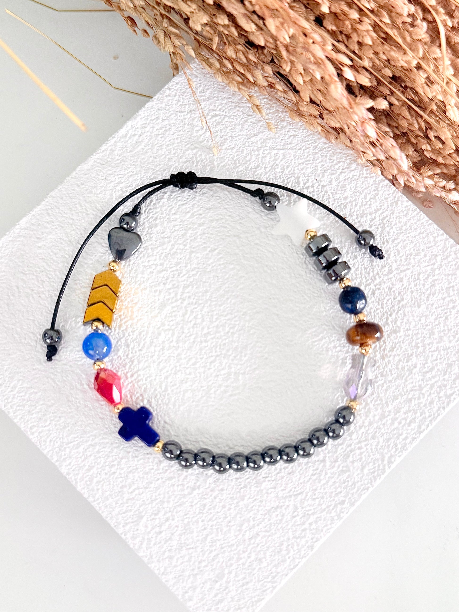 Hecha a mano con piedras semipreciosas, hematite, cristales y balines enchapados en oro 18k. Su diseño neutro en hilo ajustable negro la convierte en una pieza versátil y elegante, perfecta para el uso diario.