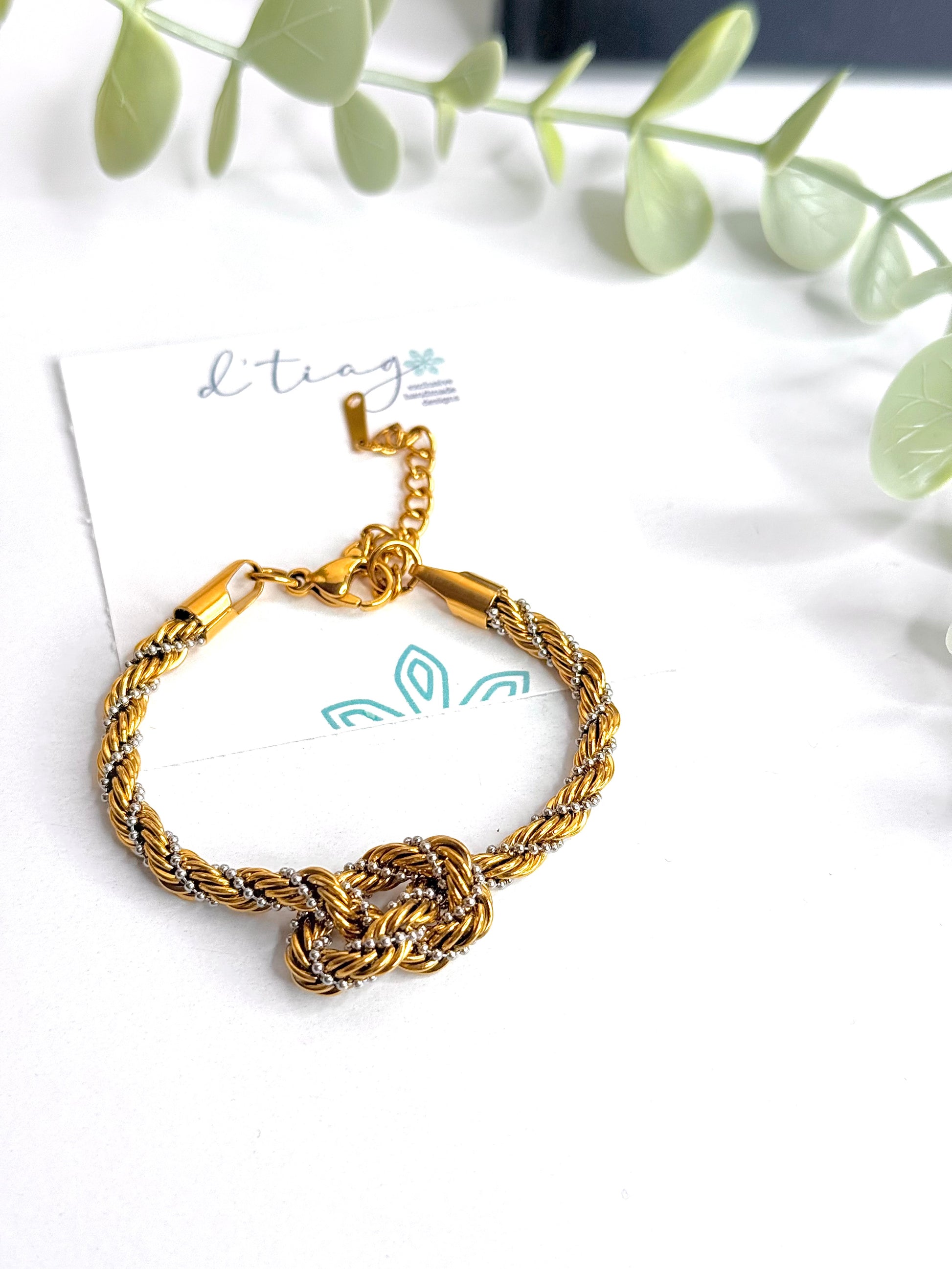 Pulsera doble tono en acero inoxidable, con un diseño elegante y moderno que destaca por su nudo central, símbolo de unión y fuerza. Su cadena gruesa aporta un toque sofisticado y a la vez audaz, ideal para lucir sola o combinar con otras piezas.