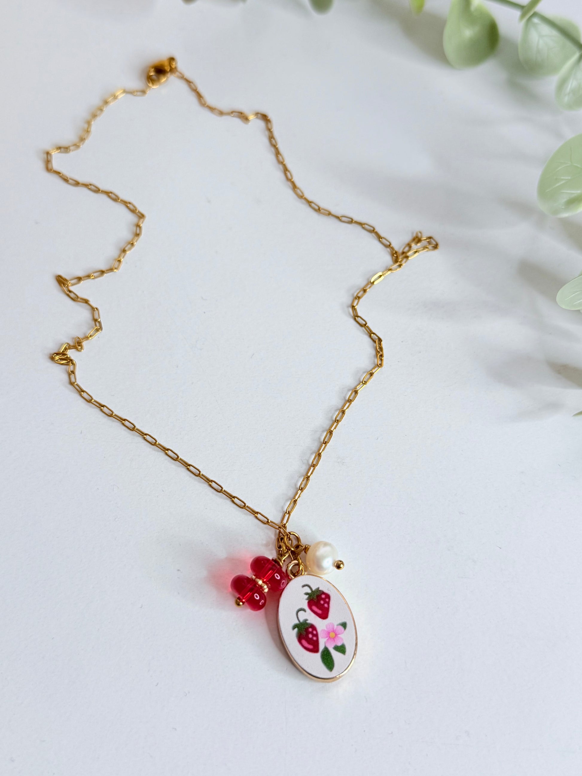 Hermosa cadena en stainless steel y detalles en colores enchapados en oro y alambrados a mano.