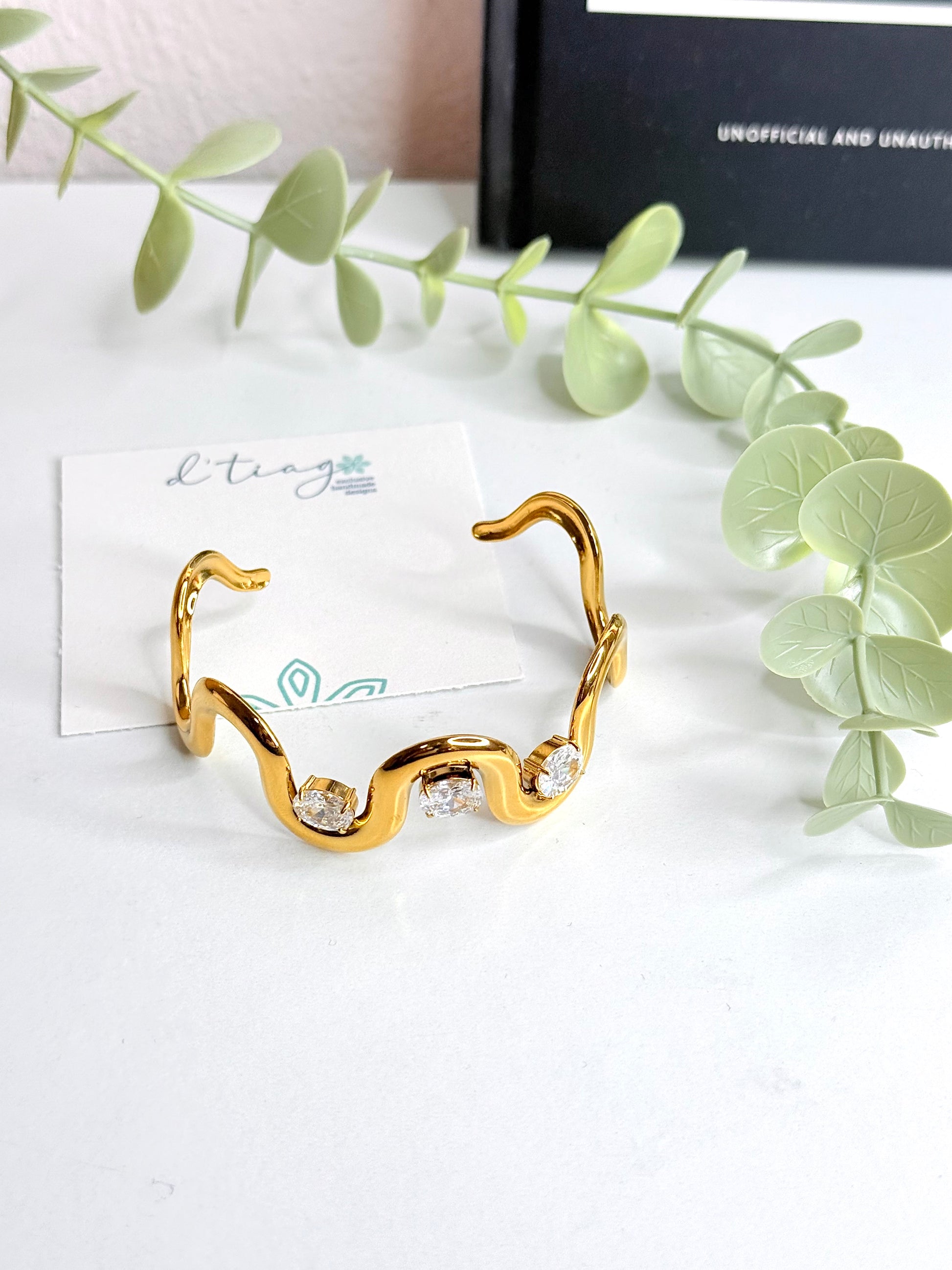 Cuff Bracelet ajustable en acero inoxidable con un diseño moderno y delicado de líneas que evocan el movimiento de las olas. En el centro, tres brillantes estilo diamante añaden un toque de elegancia y luz, creando una pieza sutil pero impactante.