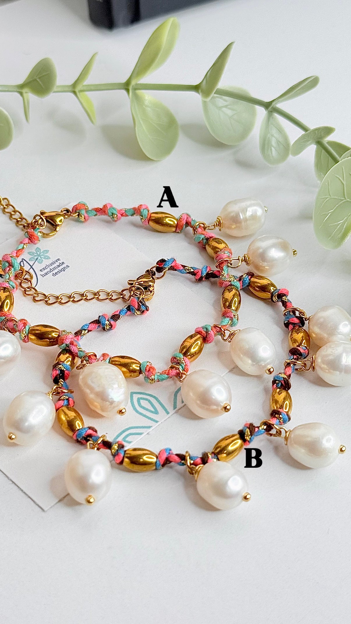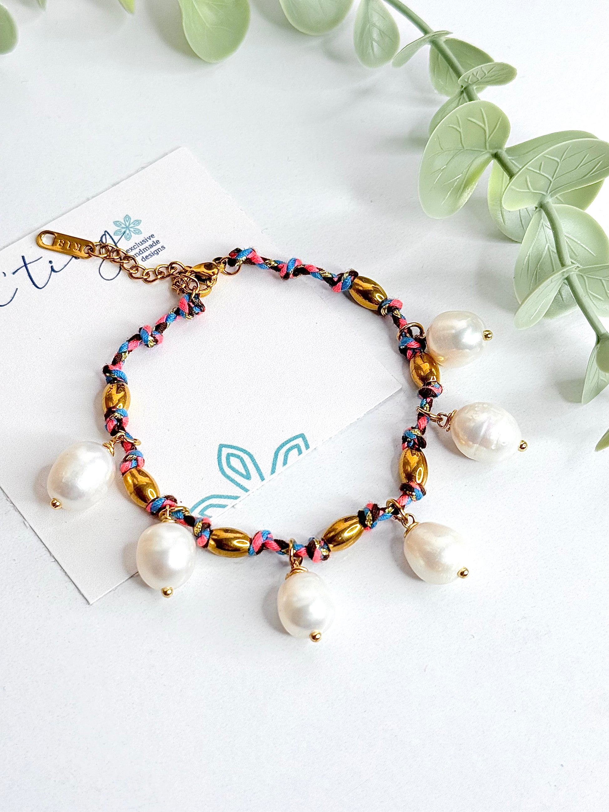 Diseñada con hilo anudado en tonos vibrantes, detalles en stainless steel dorado y perlas alamabradas cultivadas en agua dulce que aportan un aire sofisticado y chic.
