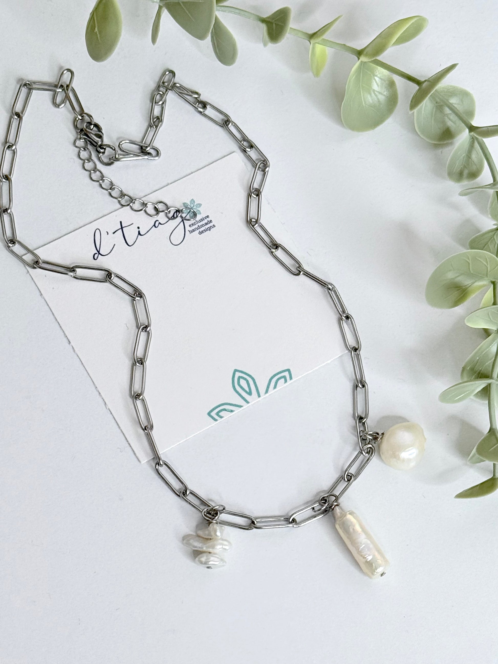 CadenA paperclip en stainless steel con perlas naturales alambradas. Cadena mide 17” pero ajusta como choker.