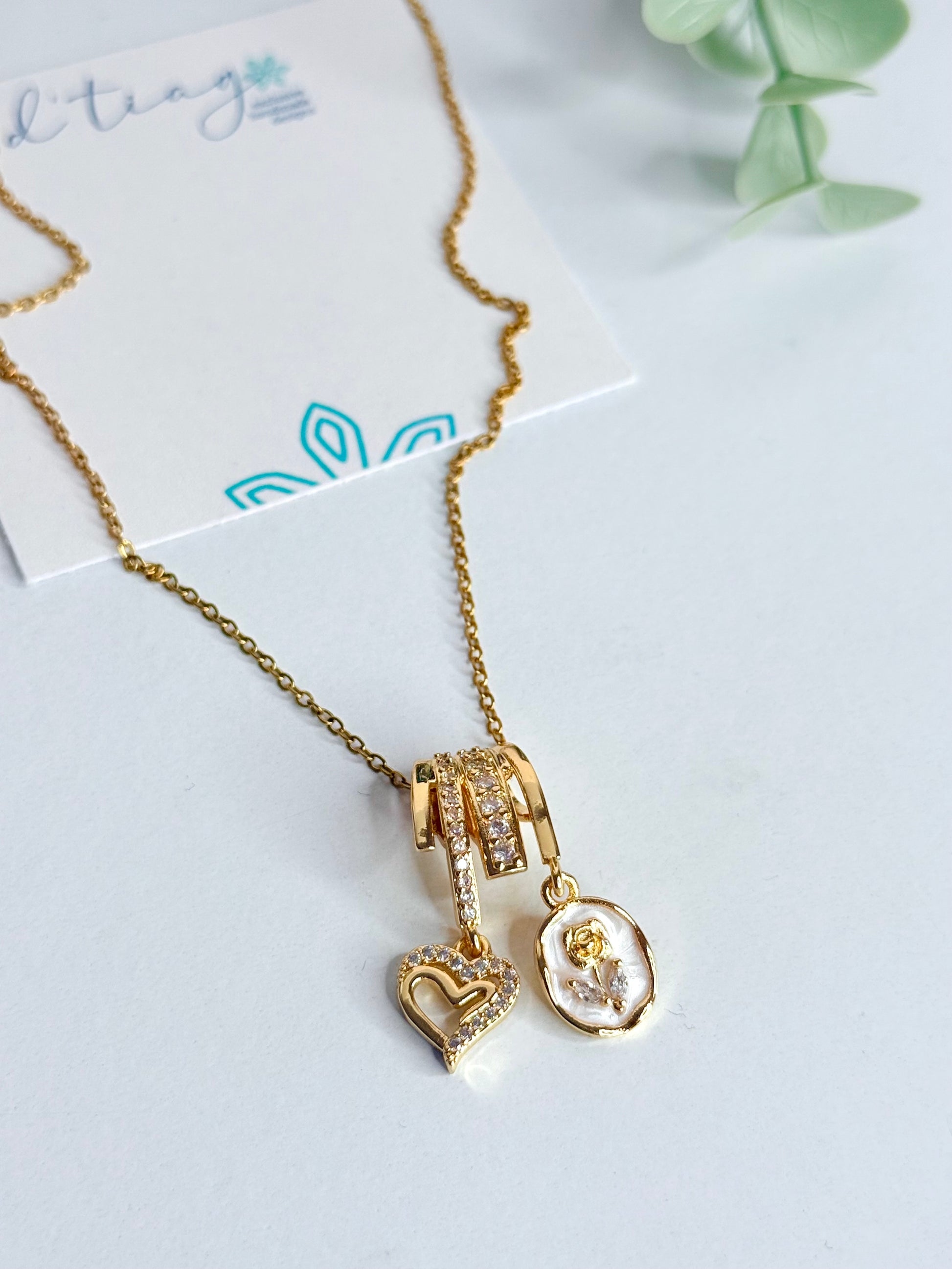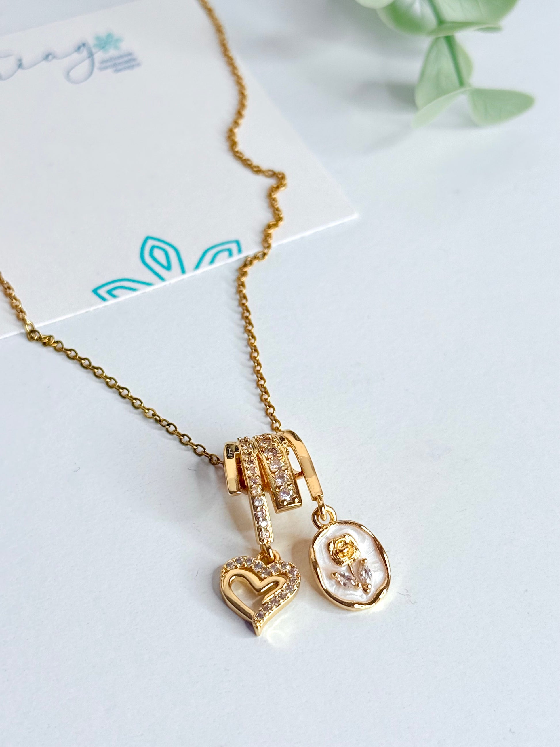 Un collar delicado y lleno de significado que combina un corazón con circonias brillantes y un camafeo con diseño floral en una medalla ovalada. Su estilo romántico y femenino lo hace perfecto para regalar o para llevar como detalle especial todos los días.