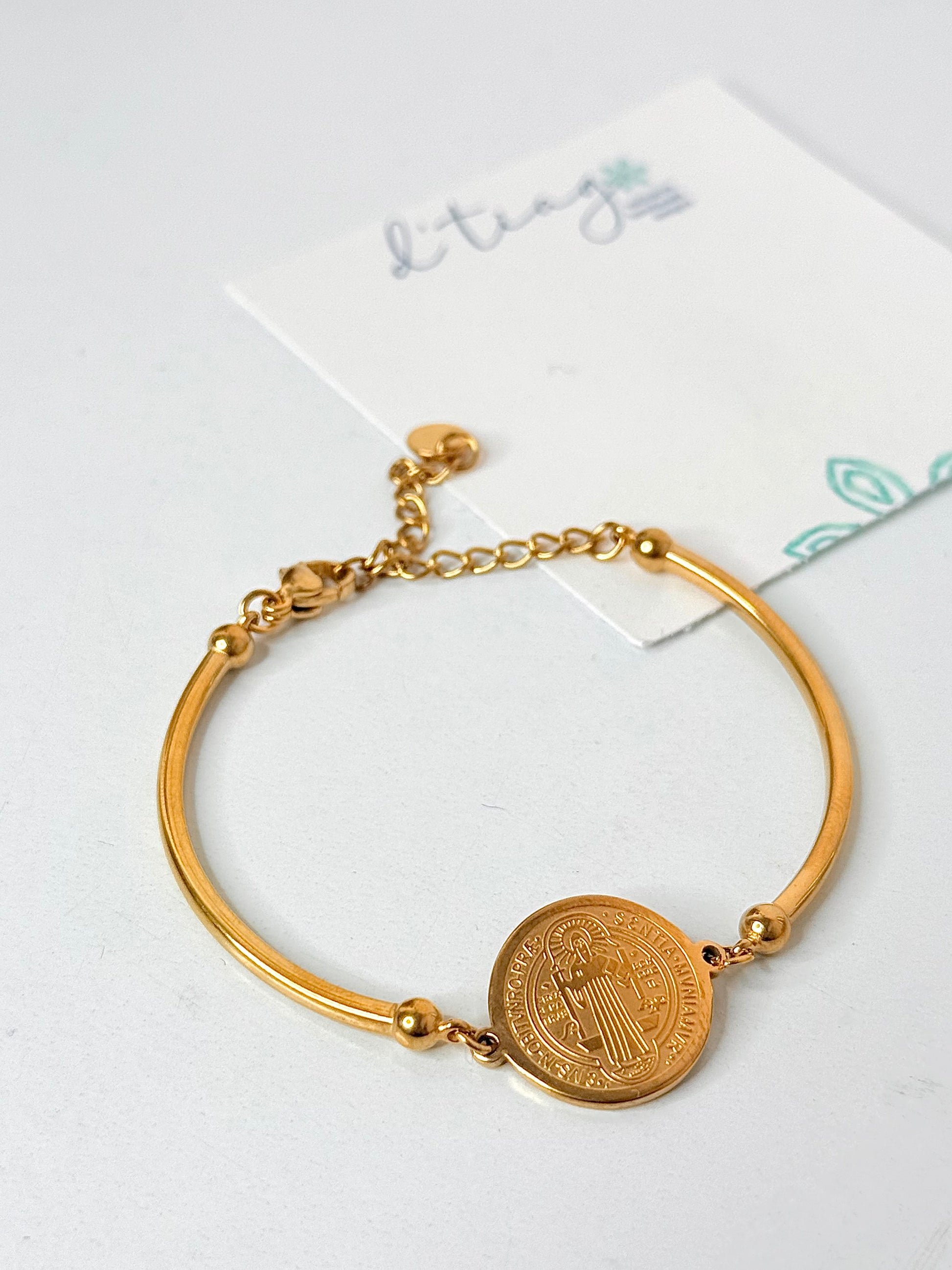 Pulsera en acero inoxidable de “San Benito”. La pulsera trae cierre con ajustador.
