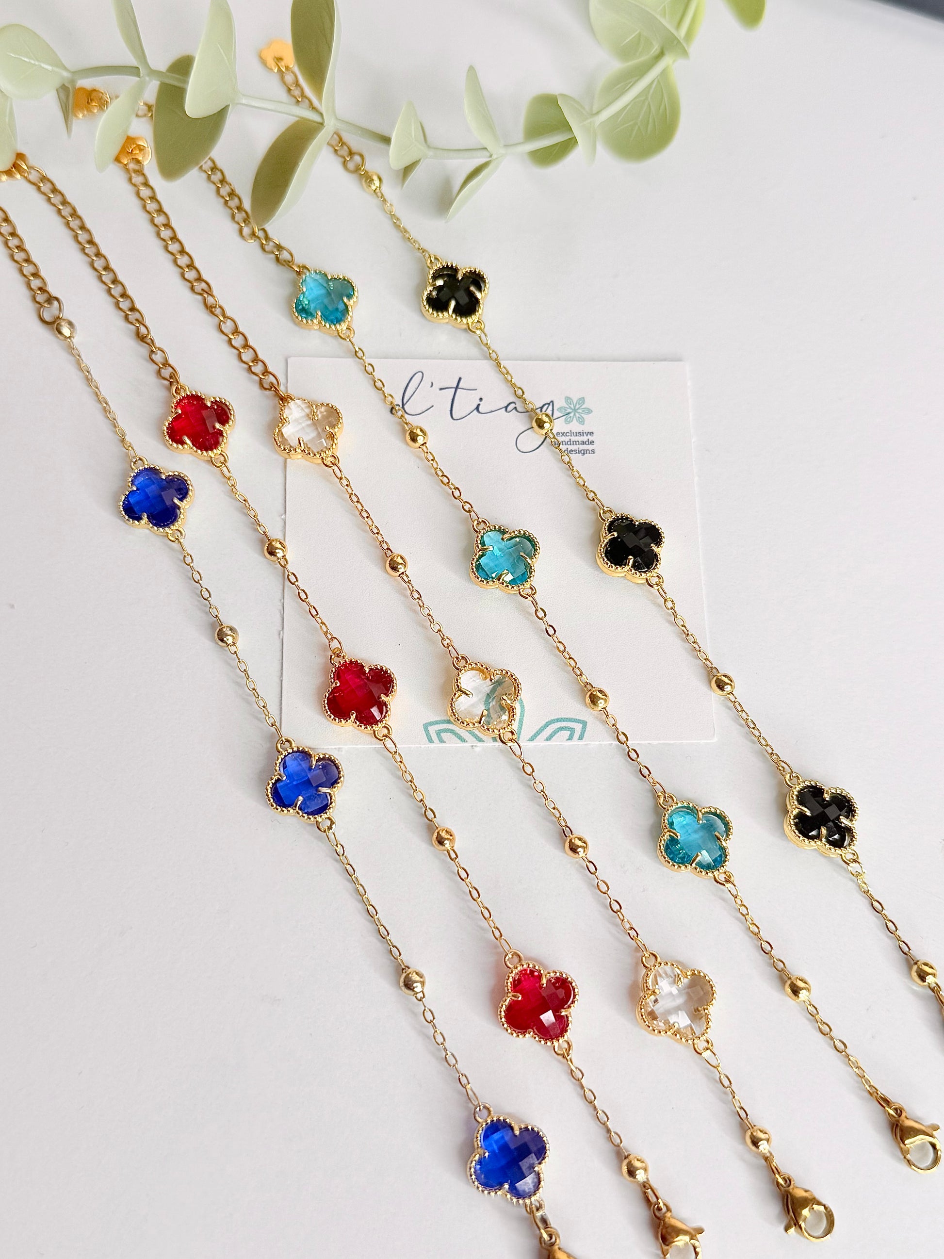 Cada pieza está diseñada con un delicado trébol en cristal de colores vibrantes, perfecto para quienes buscan un accesorio sofisticado pero versátil.